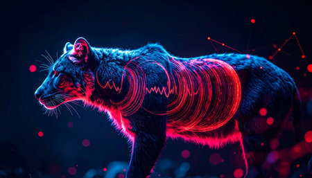 Captivating digital illustration of a powerful bull, rendered with glowing blue and orange neon lines, charged with electric lightning. Represents strength, financial markets, and high-energy performance, ideal for technology, finance, or creative design projects.
