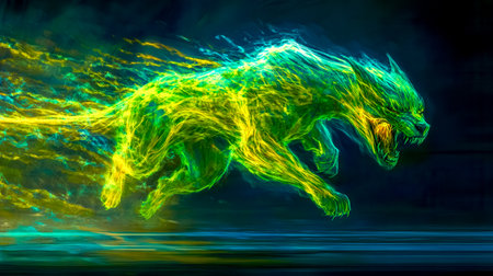 Green fire wolf running and attacking with speed and agility