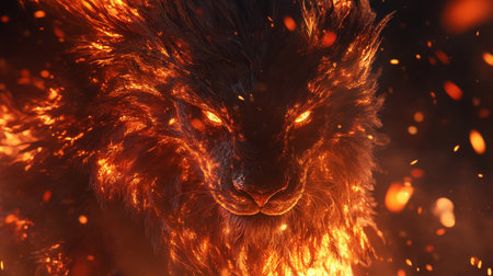 A close-up image presents a lion with a fiery mane and glowing eyes against a black background. The artwork uses warm, vibrant colors, emphasizing textures and details. The composition may be suitable for various commercial purposes, including advertising and editorial content. The lighting creates a dramatic effect.