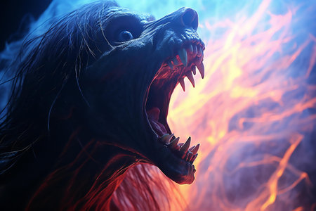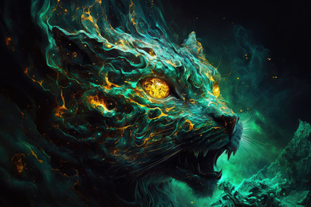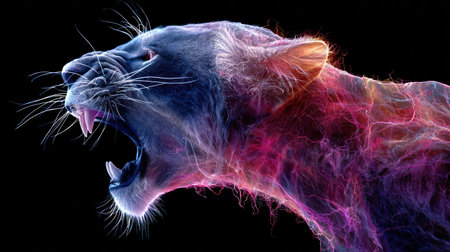 Colorful lion is shown in this artistic image of lion with its mouth open. Generative AI.