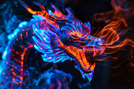 glowing dragon, fantasy creature, digital art, mystical, vibrant colors, neon lights, abstract design, blue and orange tones, ethereal background, animated style