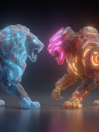This striking image showcases two futuristic digital lions engaged in a fierce battle. The neon glow and intricate designs highlight the blend of art and technology.