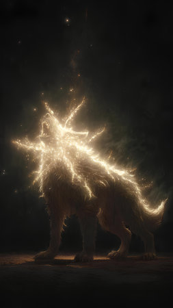 Majestic creature emerges from darkness with swirling mist and glowing features