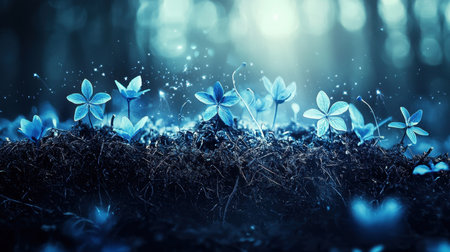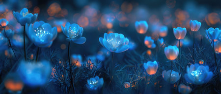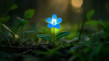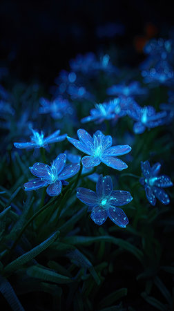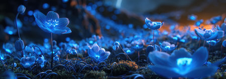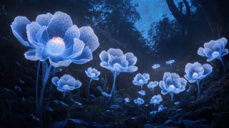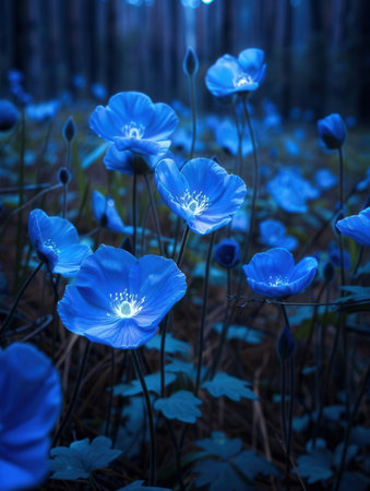 The image showcases ethereal blue flowers in a dimly lit forest setting. The flowers emit a soft, internal glow, creating a magical atmosphere. The composition uses selective focus, highlighting the delicate petals and stems against a blurred background. Suitable for various creative and conceptual projects.