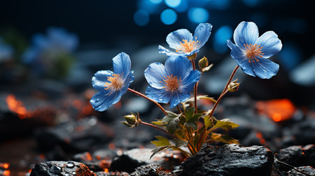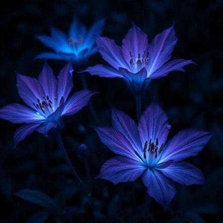 Colorful blue flowers flourish against a dark background capturing delicate petal textures and graceful shapes. Soft lighting highlights their beauty and charm.