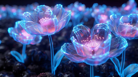 Futuristic Neon Flowers in Digital Landscape. High-Tech Blooms with Glowing Blue and Pink Light