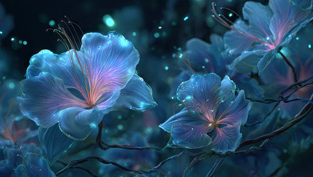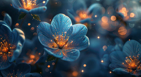 The image features luminous blue flowers with delicate petals against a dark backdrop. The soft lighting and bokeh effect create a whimsical atmosphere. The composition is close-up, emphasizing the textures and details of the blossoms. Suitable for illustrative projects or artistic compositions.