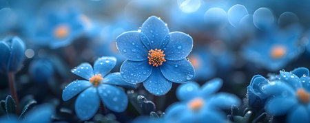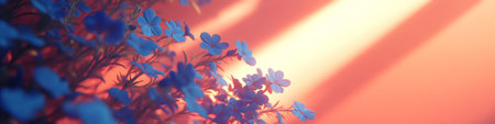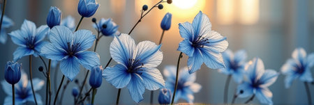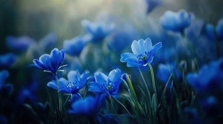 Blue flowers in morning light: natures delicate symphony. That the image is generated using AI.