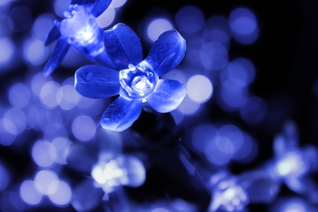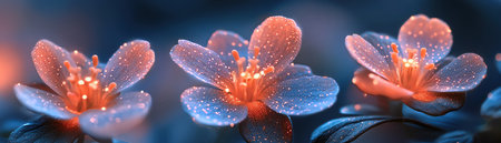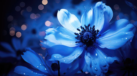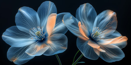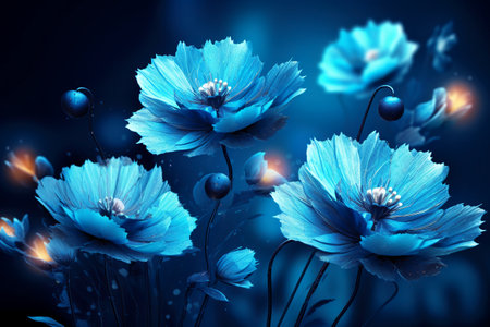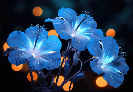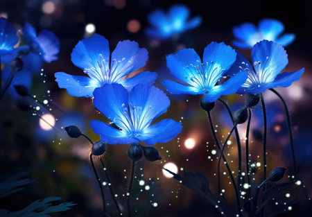 Close-up of radiant blue flowers illuminated against a dark backdrop showcases delicate petals. The composition and lighting create a dramatic effect. This image could be suitable for various applications, including botanical illustrations, decorative elements, and conceptual designs. It offers visual interest suitable for editorial and commercial uses.