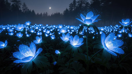 A vibrant collection of blue flowers scattered across the green grass, Bioluminescent plants lighting up a night scene, AI Generated