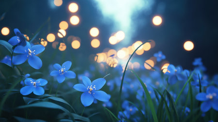A tranquil scene featuring vibrant blue flowers set against soft bokeh lights, creating a magical atmosphere in nature, perfect for any floral or serenity-themed project.