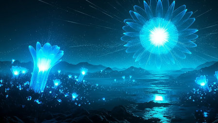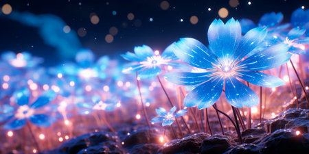 A breathtaking view of blue flowers blooming under a starry night sky, creating a magical atmosphere in a serene landscape. Perfect for nature lovers.