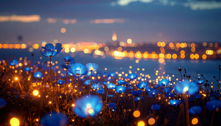 An enchanting and surreal landscape featuring luminous blue flowers that seem to glow in the foreground, with the sparkling cityscape and water at dusk creating a stunning bokeh effect in the background. This magical scene blends nature with urban light, perfect for themes of fantasy, romance, and evening tranquility.