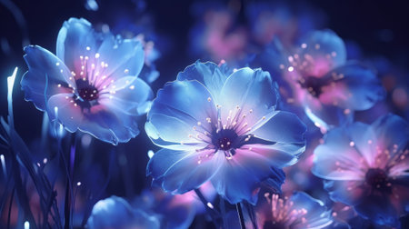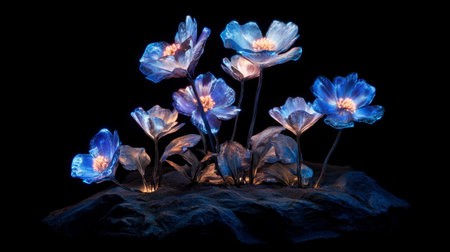 Stunning blue flowers emit a soft glow in a dark setting, creating a captivating and serene atmosphere. Perfect for art, decor, and nature themes.