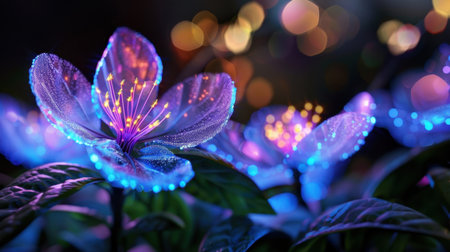 Bioluminescent flowers, ultraviolet glow, enchanted flora, nighttime magical garden