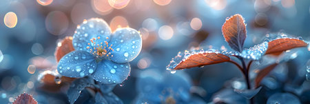 This enchanting image showcases vibrant flowers adorned with glistening dewdrops, set against a colorful bokeh background that creates a magical atmosphere.
