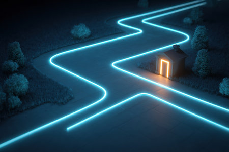 An animated map shows a winding route illuminated by neon lights, culminating at a glowing doorstep icon, creating a calm evening ambiance.