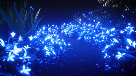 Explore a captivating night scene featuring a pathway surrounded by luminous blue flowers. This enchanting garden offers a magical escape into nature's beauty.