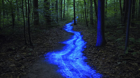 Bioluminescent forest path, natural nightlights guide the way