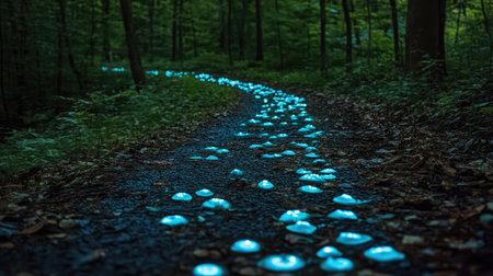 There is a serene and enchanting path winding through the woods, illuminated by glowinthedark lights that shimmer on the ground