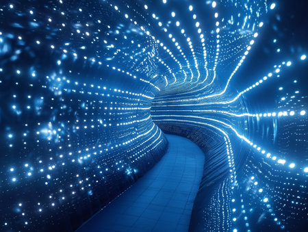 A curved tunnel illuminated by numerous blue LED lights, creating a mesmerizing, futuristic ambiance