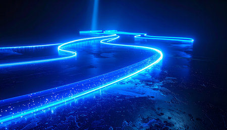 A vibrant blue stream of light carves a path through the darkness, representing the rapid flow of data and energy.