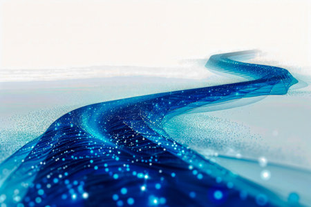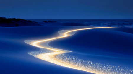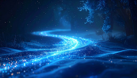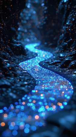 This stunning image features a flowing blue stream of sparkling light against a dark background, evoking feelings of tranquility and wonder in a dreamlike atmosphere.