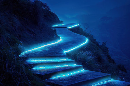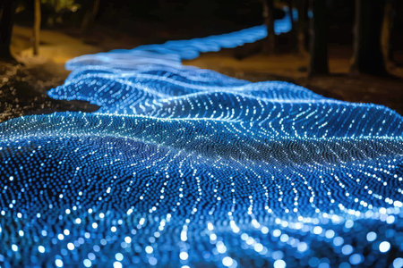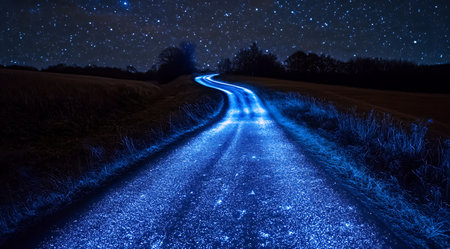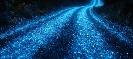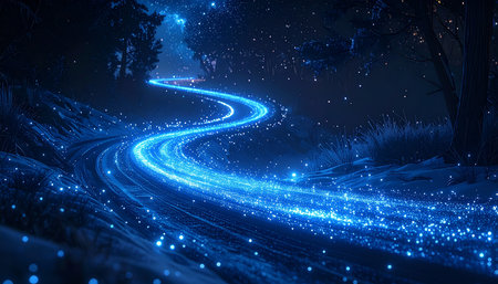Magical Glowing Pathway Bioluminescent Blue Lights Illuminating a Winding Road at Night.