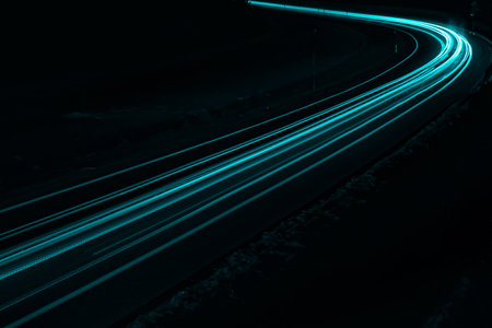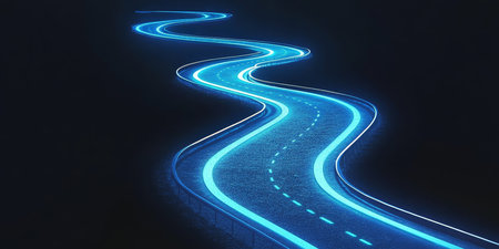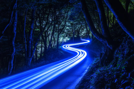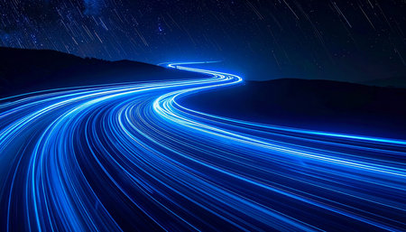 Winding Road, Night, Blue Trails of Light, Dark Background, Sleek Vector Lines, Clear Image