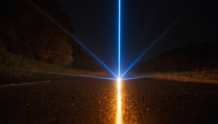 Blue laser beam on asphalt road at night. Long exposure photo.