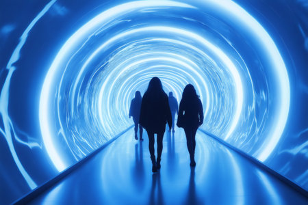 Silhouetted visitors walking through a glowing blue interactive light tunnel, experiencing modern art and technology in a contemporary museum