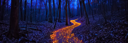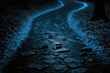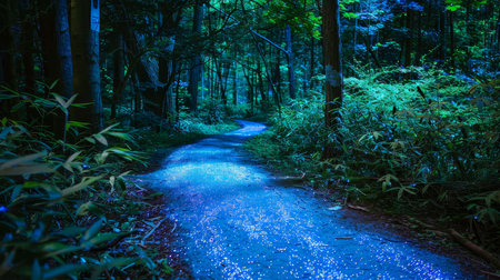 A mesmerizing nighttime scene featuring a winding path illuminated by blue light cutting through a dark forest, creating a mystical and ethereal atmosphere.