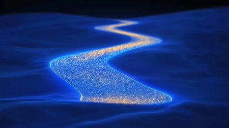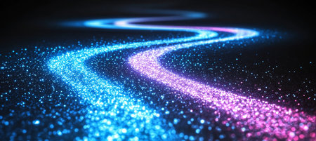 An abstract representation of a glowing light path set against a dark background. The gentle shimmer and sparkles create an enchanting and futuristic atmosphere.