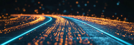 Open road under starry night sky with neon blue lines, futuristic travel concept