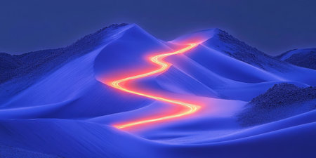 Glowing blue neon path through dark rocky canyon, serene and futuristic concept