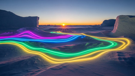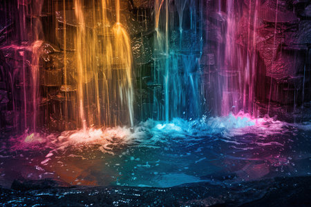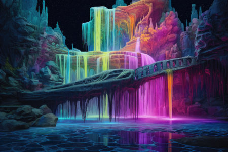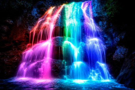 neon rainbow-colored cascading waterfall at night, created with generative ai