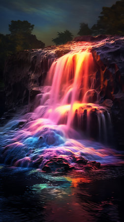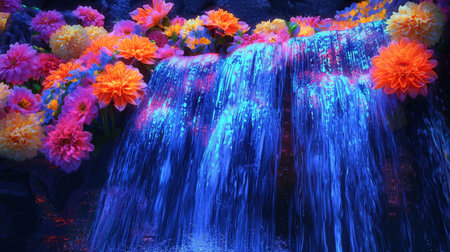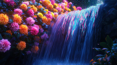 Vibrant Neon Petal Waterfall A captivating digital art landscape showcasing a cascading waterfall with a surreal ethereal The flow of water is enhanced by a mesmerizing array of colorful petals