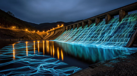 Stunning view of dam night, showcasing illuminated water cascading down structure, creating mesmerizing effect with blue light trails reflecting water surface. surrounding landscape features