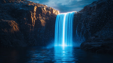 A breathtaking blue luminescent waterfall glows brightly as it cascades into a tranquil lake, surrounded by dark, rugged cliffs under a twilight sky.