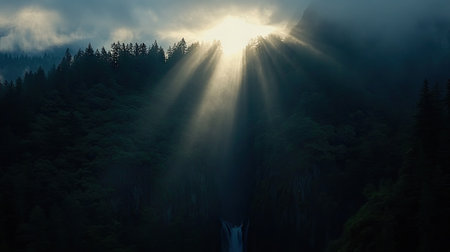 waterfall in the style of atmospheric woodland imagery, misty gothic, aerial view.