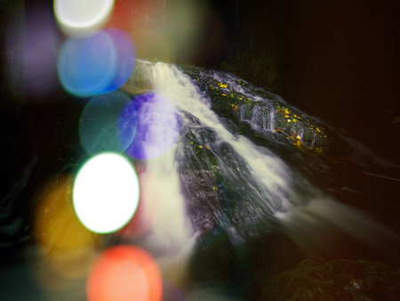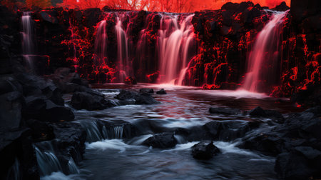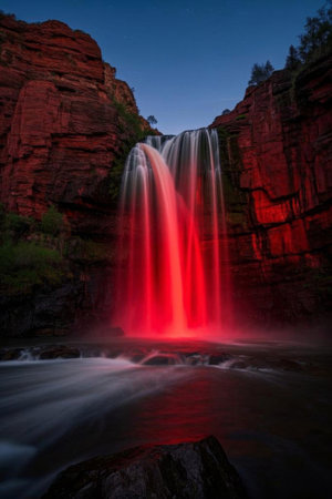 Natural waterfall in red light at night