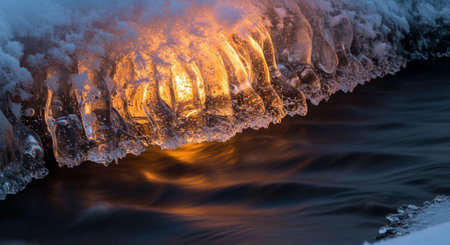 A close-up view of a stunning waterfall flowing over dark rocks, capturing shimmering golden light at sunset, creating a serene and tranquil atmosphere.
