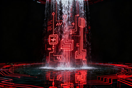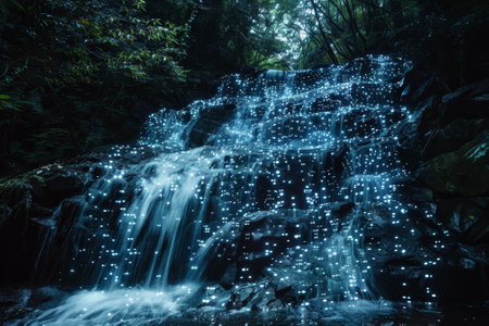 In a hidden nocturnal landscape, a powerful waterfall cascades not with water, but with a glowing stream of digital data.