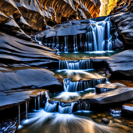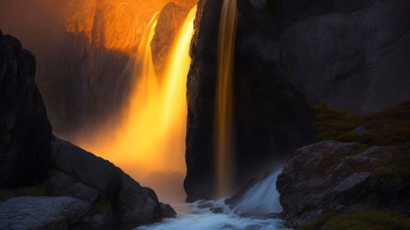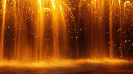 A stunning view of a glowing waterfall illuminated in golden hues, creating a tranquil and serene atmosphere. The image captures the beauty of light reflecting off water, perfect for nature-themed projects.