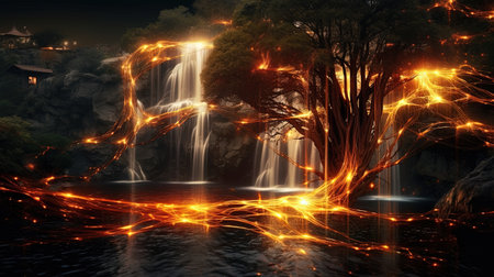 Magical fire waterfall in forest