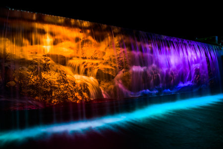 The water flows through the lights with beautiful colors at night.