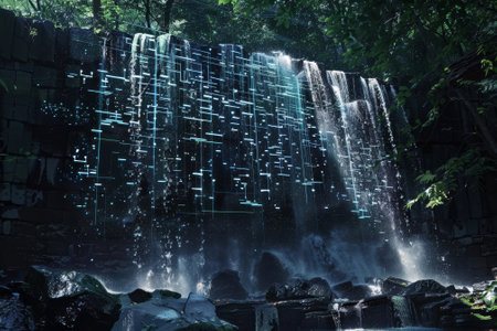A stunning waterfall cascades into a serene pool, juxtaposed with glowing digital patterns on a rocky wall. Lush greenery surrounds this enchanting location during daylight.