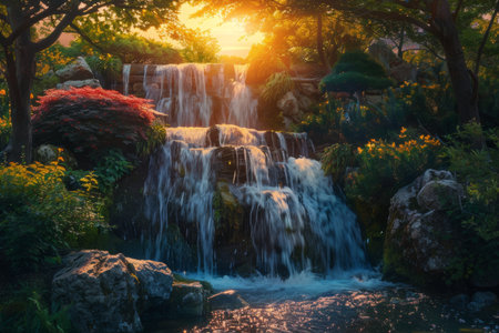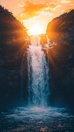 Majestic waterfall cascading under a vibrant sunset in a tranquil landscape