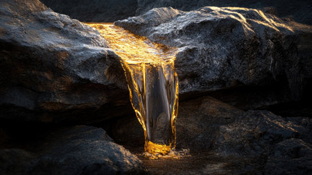Molten golden liquid cascades smoothly over dark rocks, illuminated to evoke mystery, transformation, and the allure of hidden treasures