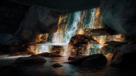 A digital waterfall projection cascading glowing rocks cave neon abstract surreal night